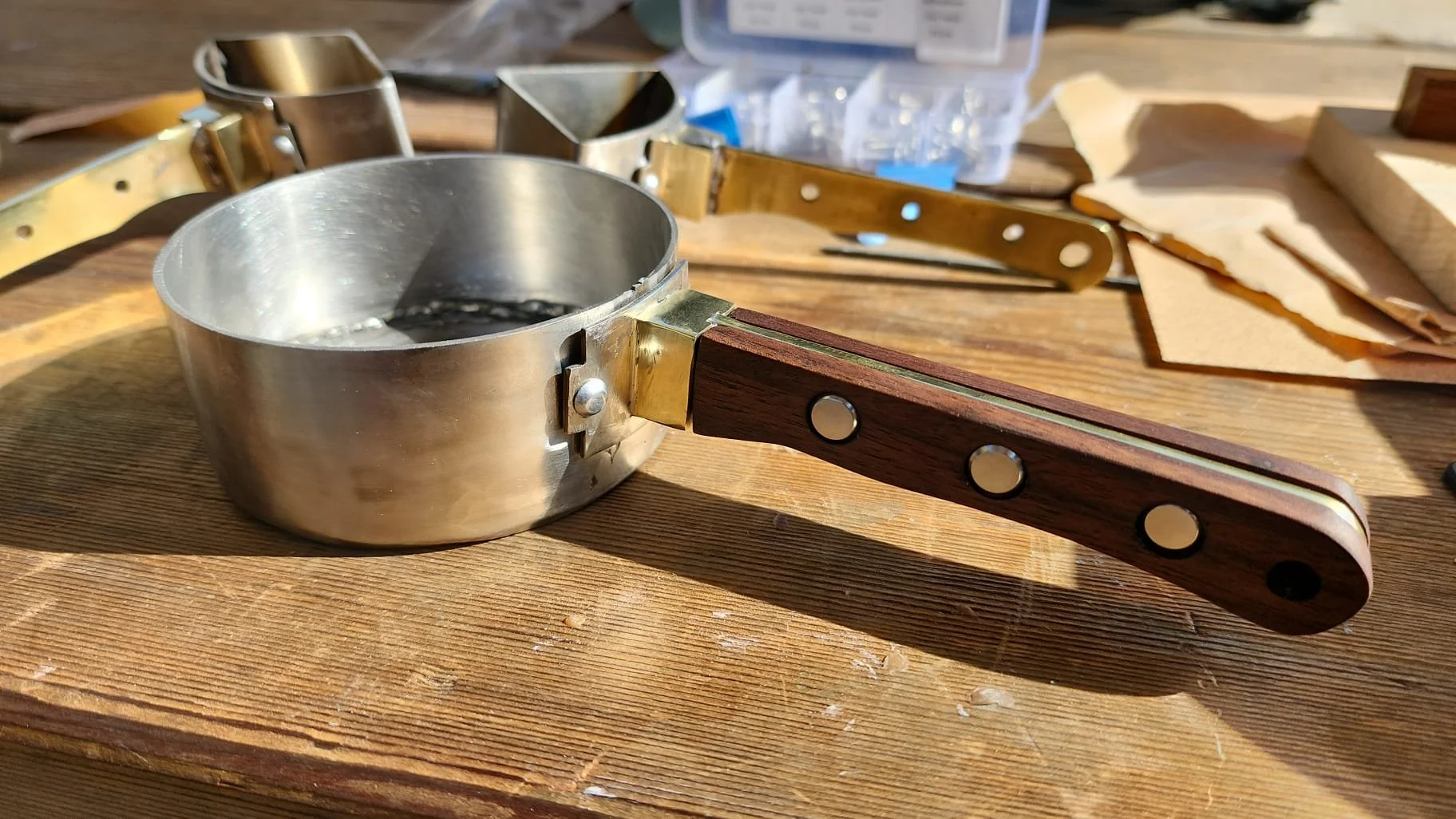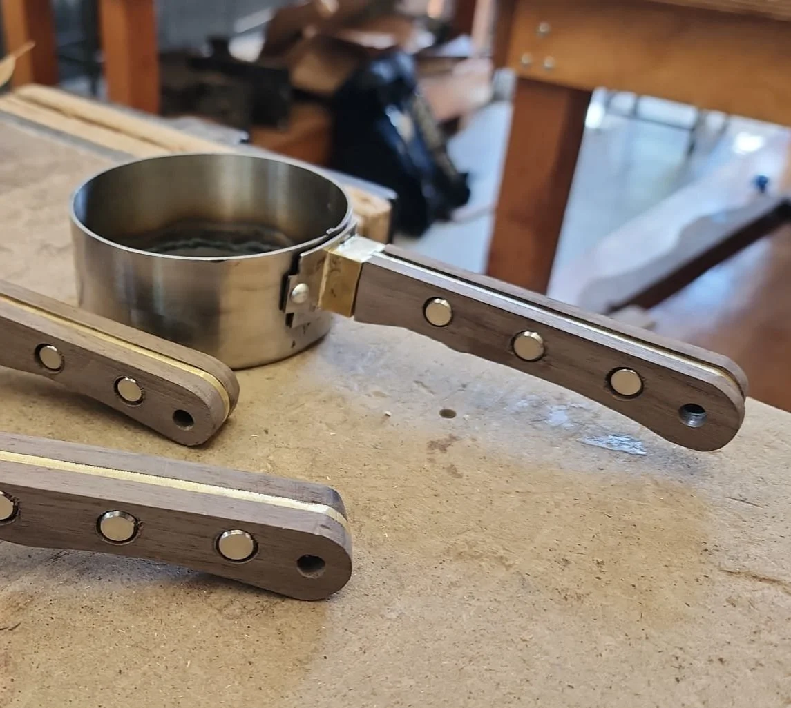 The handle would be made from wood for balance and aesthetics. A piece would need to be machined to connect the handle to the cup.