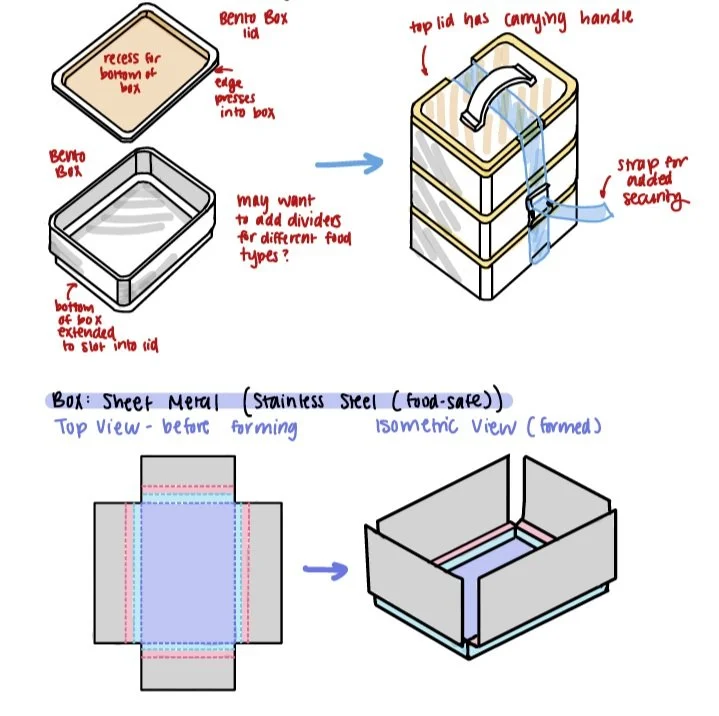 As shown, each box would stack on each other. This allows for easy storage and portioning. The metal box would need to be waterjet cut and formed using a finger brake before being TIG welded.