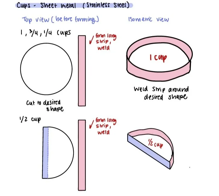 I chose to pursue the measuring cup project. I felt that it provided the most flexibility (as more or less cups could be made as needed) and provided options to incorporate a range of fabrication processes. The next step was to create a CAD assembly to determine dimensions for each part.